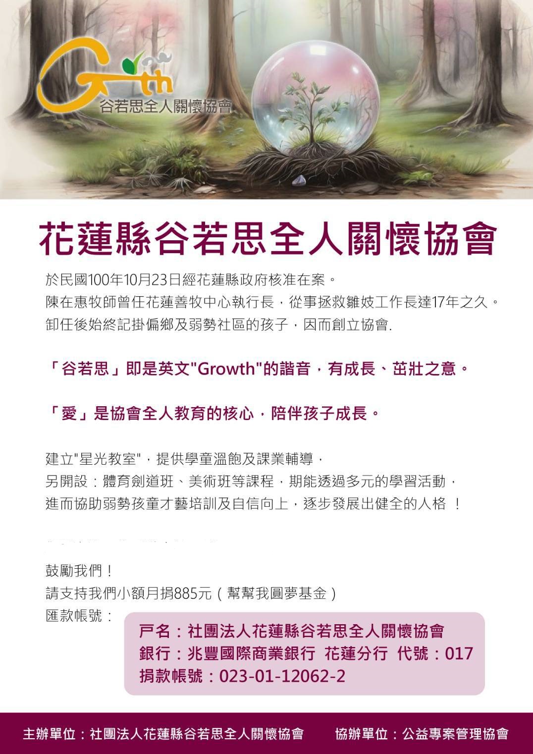 陳在惠理事長說:「孩子的人生是不能等待的,協助弱勢孩子順利成長,是社會工作刻不容緩的責任。」感謝您的支持與贊助,我們每一筆經費的運用皆以服務對象的權益為考量;珍惜社會大眾每一筆資源,讓每一筆經費發揮出最大效益。谷若思將帶著您的愛心陪弱勢孩子走向未來的路,一路上有您,真好!